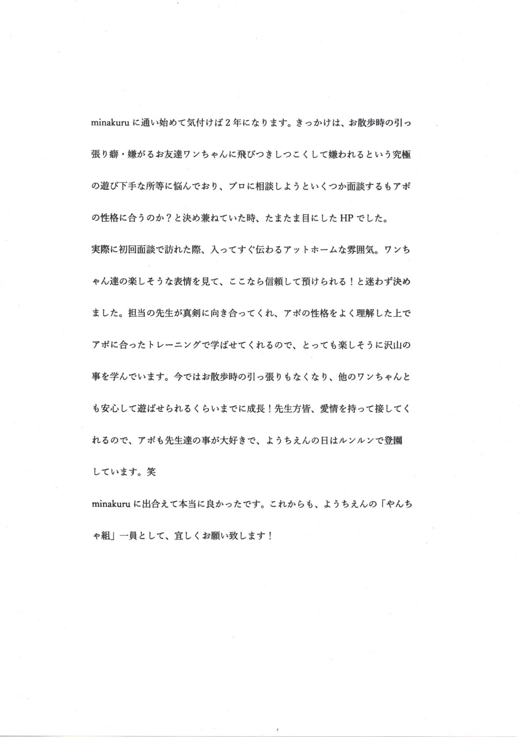 担当の先生が真剣に向き合ってくれ、アポの性格をよく理解した上でアポに合ったトレーニングで学ばせてくれるので、とっても楽しそうに沢山の事を学んでいます。今ではお散歩時の引っ張りもなくなり、他のワンちゃんとも安心して遊ばせられるくらいまでに成長!先生方皆、愛情を持って接してくれるので、アポも先生達の事が大好きで、ようちえんの日はルンルンで登園しています。笑