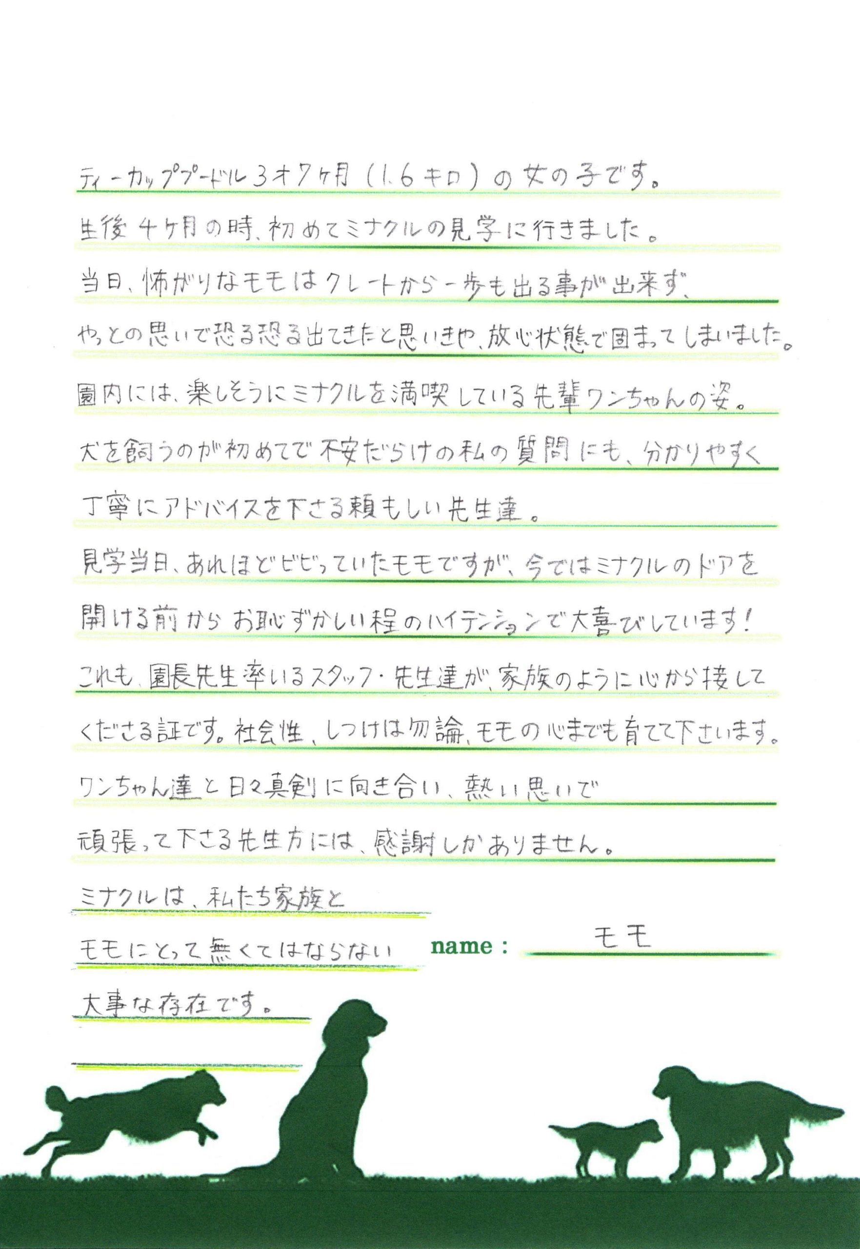 ティーカッププードル3才7ヶ月(1.6キロ)の女の子です。生後4ヶ月の時、初めてミナクルの見学に行きました。