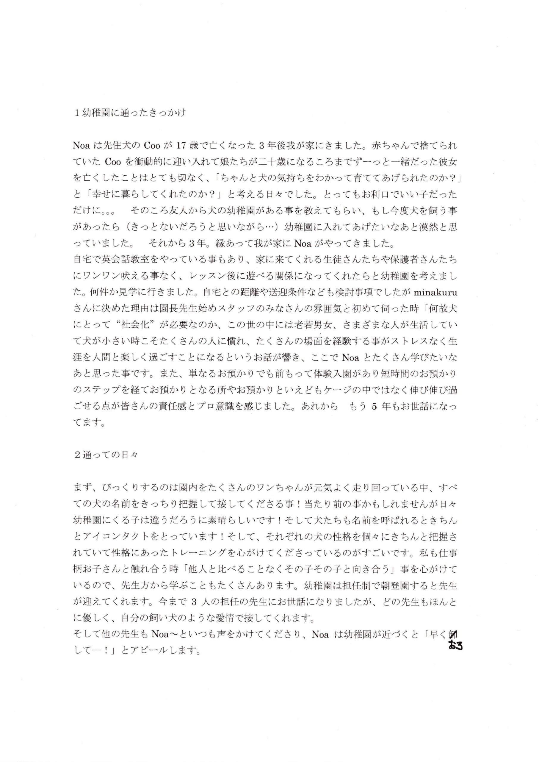 自宅で英会話教室をやっている事もあり、家に来てくれる生徒さんたちや保護者さんたちにワンワン吠える事なく、レッスン後に遊べる関係になってくれたらと幼稚園を考えました。何件か見学に行きました。自宅との距離や送迎条件なども検討事項でしたがminakuruさんに決めた理由は園長先生始めスタッフのみなさんの雰囲気と初めて伺った時「何故犬にとって“社会化”が必要なのか、この世の中には老若男女、さまざまな人が生活していて犬が小さい時こそたくさんの人に慣れ、たくさんの場面を経験する事がストレスなく生涯を人間と楽しく過ごすことになるというお話が響き、ここでNoaとたくさん学びたいなあと思った事です。また、単なるお預かりでも前もって体験入学があり短時間のお預かりのステップを経てお預かりとなる所やお預かりといえどもケージの中ではなく伸び伸び過ごせる点が皆さんの責任感とプロ意識を感じました。あれからもう5年もお世話になっています。