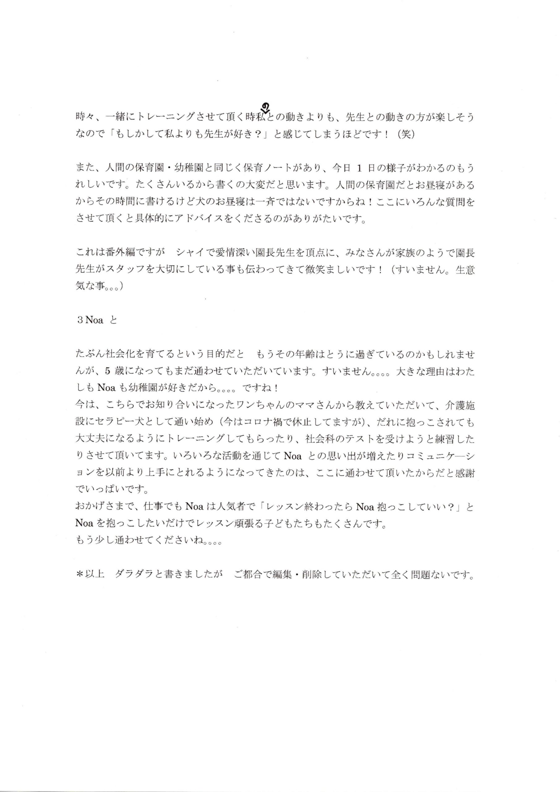 今は、こちらでお知り合いになったワンちゃんのママさんから教えていただいて、介護施設にセラピー犬として通い始め、(今はコロナ禍で休止していますが)、だれに抱っこされても大丈夫になるようにトレーニングしてもらったり、社会化のテストを受けようと練習したりさせて頂いてます。いろいろな活動を通じてNoaとの思い出が増えたりコミュニケーションを以前より上手にとれるようになってきたのは、ここに通わせて頂いたからだと感謝でいっぱいです。