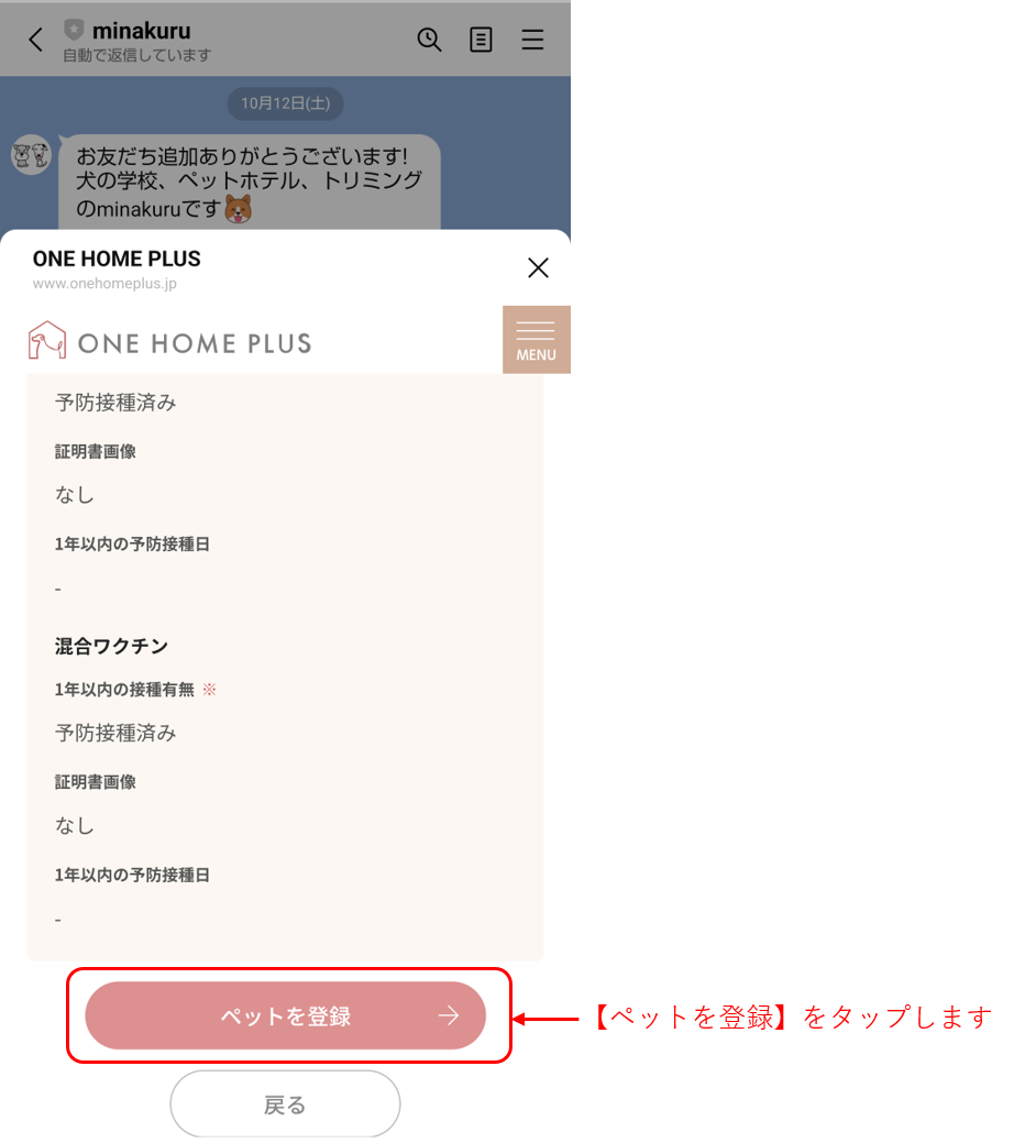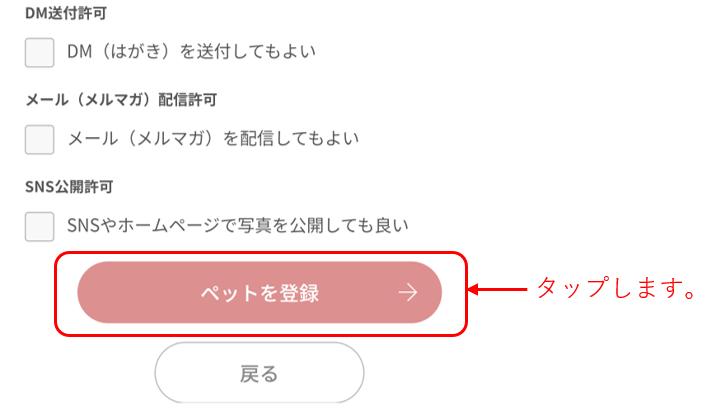 9. 入力内容に間違いが無ければ再度【ペットを登録】をタップします。