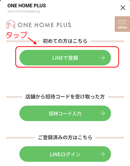 「初めての方はこちら」で【LINE】で登録をタップします。
