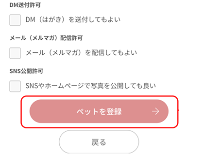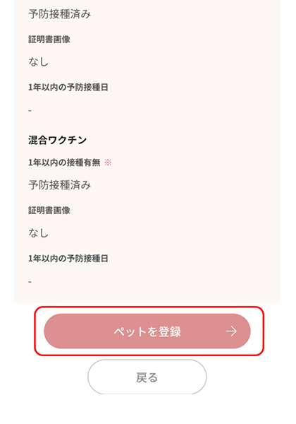 表示された確認画面の内容にお間違いなければ、もう一度「ペットを登録」をタップして、登録完了となります。
