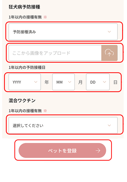 各種予防接種の有無で「予防接種済み」をお選びいただくと、『狂犬病予防接種』と『混合ワクチン接種の証明書』のアップロード画面が表示されます。